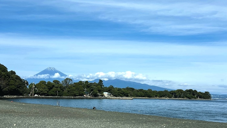 ほんのり雪化粧の富士山と海が目の前に広がる、大瀬崎に到着!!