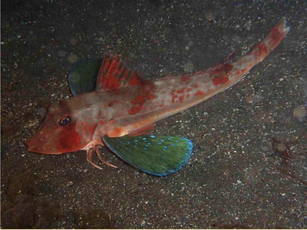 英語圏ではSearobin(シーロビン)、海の駒鳥と呼ばれていて、魚に足が生えてるように見えるホウボウもいました。